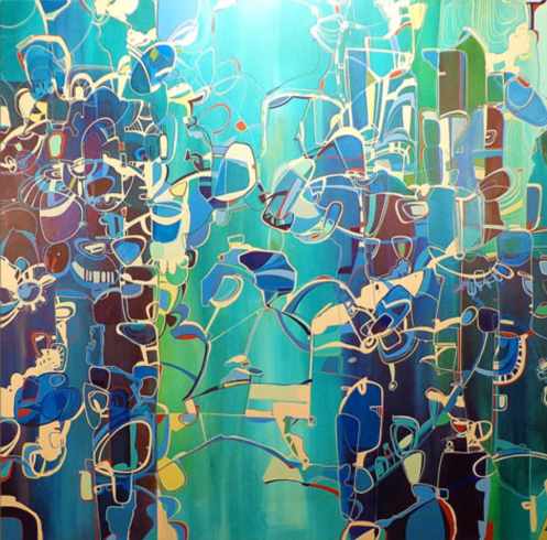 The germ of the idea for “Vitality Rising” came from seeing some coiled wire on my work table. I had been writing in my notebook musing about the experiences that art sparks in the audience.Wondering where that inspiration comes from, I engaged several artists whose work and practices I deeply admire. In those dialogues I started getting excited about the possibility of an exhibit where this seminal question is explored in the artists’ works as well as a dialogue between their works and the audience. It was my great good fortune to be able to bring together a small group of artists whose work I greatly admire; work that is both powerfully unique and at the beating heart of where contemporary painting is today. One of the central themes that ran through the works of all these artists, whose materials, strategies and execution couldn’t have been more different, was the experience of vitality. As one walks among these works, engaging them individually as well as in dialogue with one another, the audience completes the circuit that began as that vital generative spark.